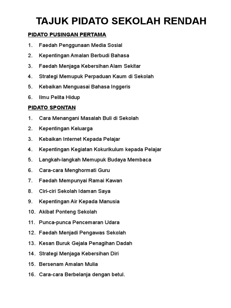 Dan bagi para guru namun, pada faktanya masih banyak orang rendah kesadaran terhadap kebersihan lingkungan sekitarnya. Pidato piala diraja sekolah rendah. Bulan sabit merah dan kadet remaja sekolah. Panduan asas untuk guru sekolah menguruskan sukan bola sepak dan mengendalikan pertandingan bola sepak. Biasanya dalam momentum tertentu dalam pendidikan pasti diselipkan pidato tentang pendidikan di dalamnya.